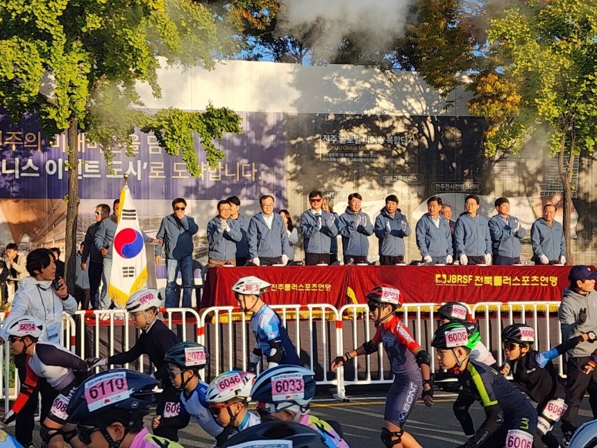 | ‘2025 전주월드인라인마라톤대회’가 열린 가운데 김경석(앞줄 왼쪽에서 다섯번째) 대한롤러스포츠연맹 회장 등이 참가 선수들을 응원하고 있다. <사진=대한롤러스포츠연맹> |